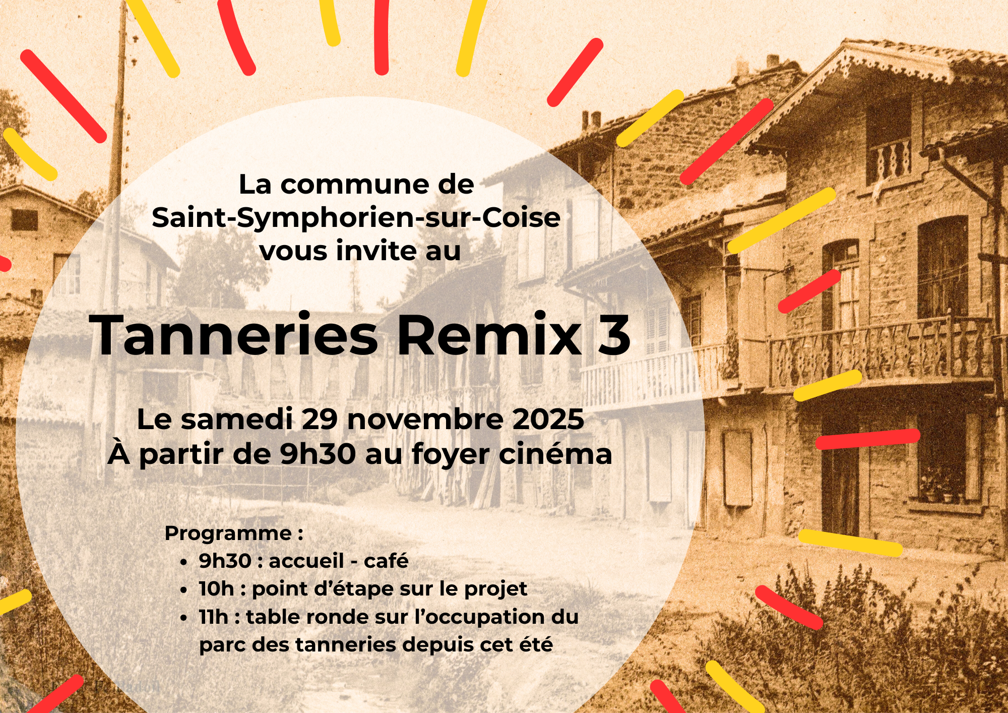 La commune de Saint-Symphorien-sur-Coise vous invite au Foyer cinéma pour :• 9h30 : accueil - café• 10h : point d'étape sur le projet• 11h : table ronde sur l'occupation du parc des tanneries depuis cet été